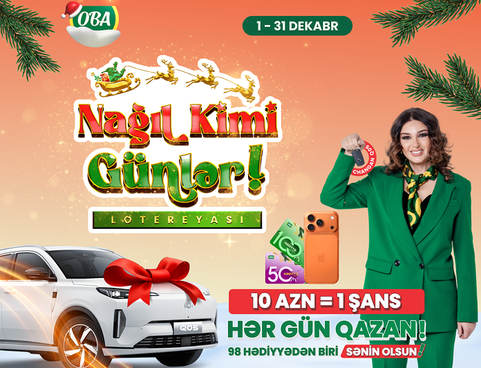 OBA ilə hər gün qazanmaq şansın var. Belə ki, 1-31 dekabr tarixlərində hər gün 3 qalib müvafiq olaraq 50, 50 və 100 AZN-lik OBA bonus kartı, hər həftə 1 qalib iphone 17 pro, qazanacaq! Böyük tirajda isə sizi 1 ədəd 2025-ci il Changan Q05 gözləyir! Odur ki siz də loteryada iştirak edin, qaliblər siyahısında olun!